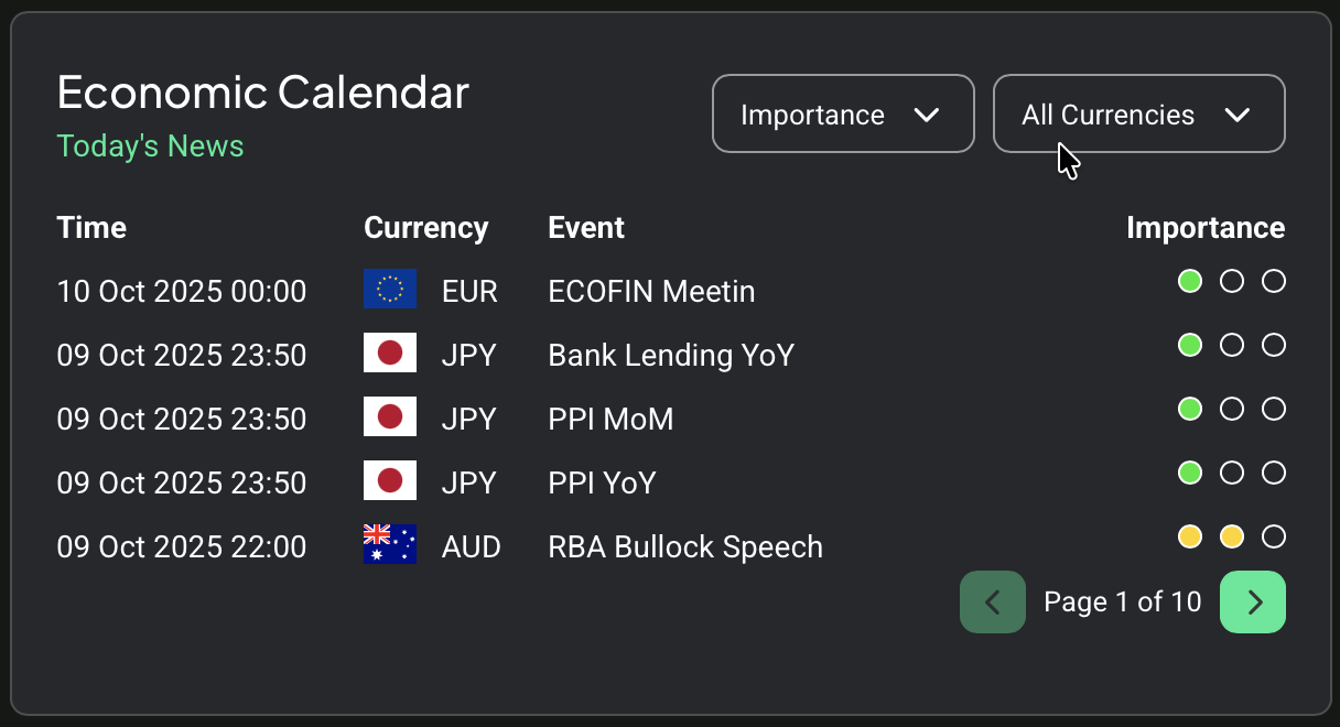 Implementation of pagination system limiting news display to 5 items per page, plus integration of filtering controls for impact levels (low, medium, high) and currency selection. This frontend enhancement improves user experience by reducing information overload and enabling targeted news consumption, consuming new backend filtering APIs and providing intuitive UI controls for traders to customize their news feed according to trading preferences and risk tolerance.