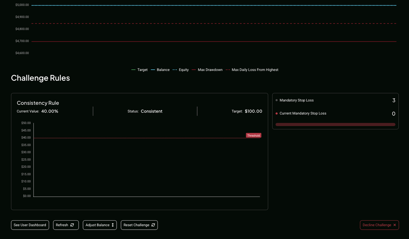 Enhanced the admin panel with comprehensive rule validation visibility including strike rules monitoring, consistency rules tracking, and minimum trading days counters for improved partner oversight capabilities.