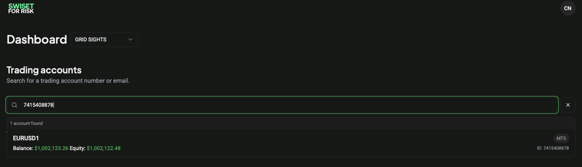 Implements frontend search interface for Swiset for Risk module enabling administrators to quickly locate trading accounts by login or email with real-time autocomplete suggestions, automatic redirect to detailed account view, and responsive white-label branding support.