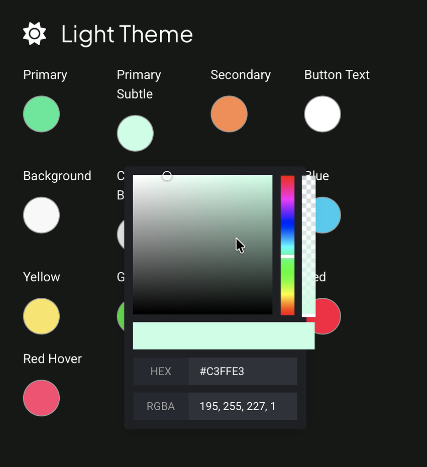 Frontend implementation of a color picker component that automatically appears when administrators click on any theme color text field in the settings interface, simplifying the color selection process and improving user experience by eliminating the need for manual HEX code entry and reducing color-related configuration errors.